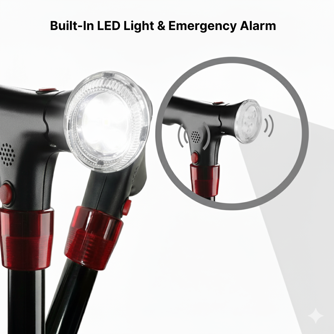 Walk with confidence even after dark. The built-in LED light illuminates your path to help you avoid obstacles, while the integrated safety alarm adds extra peace of mind - alerting others if you need help, indoors or out.